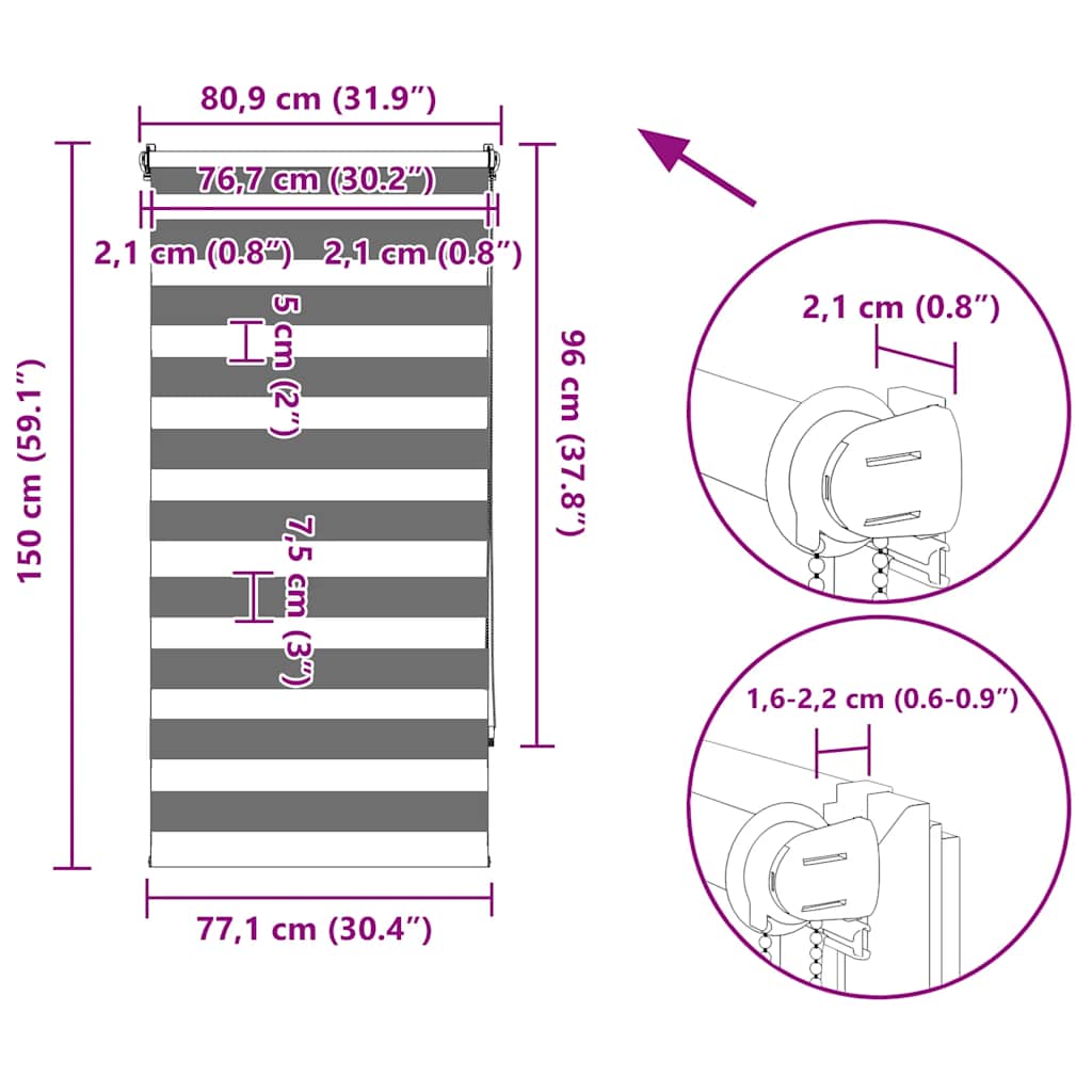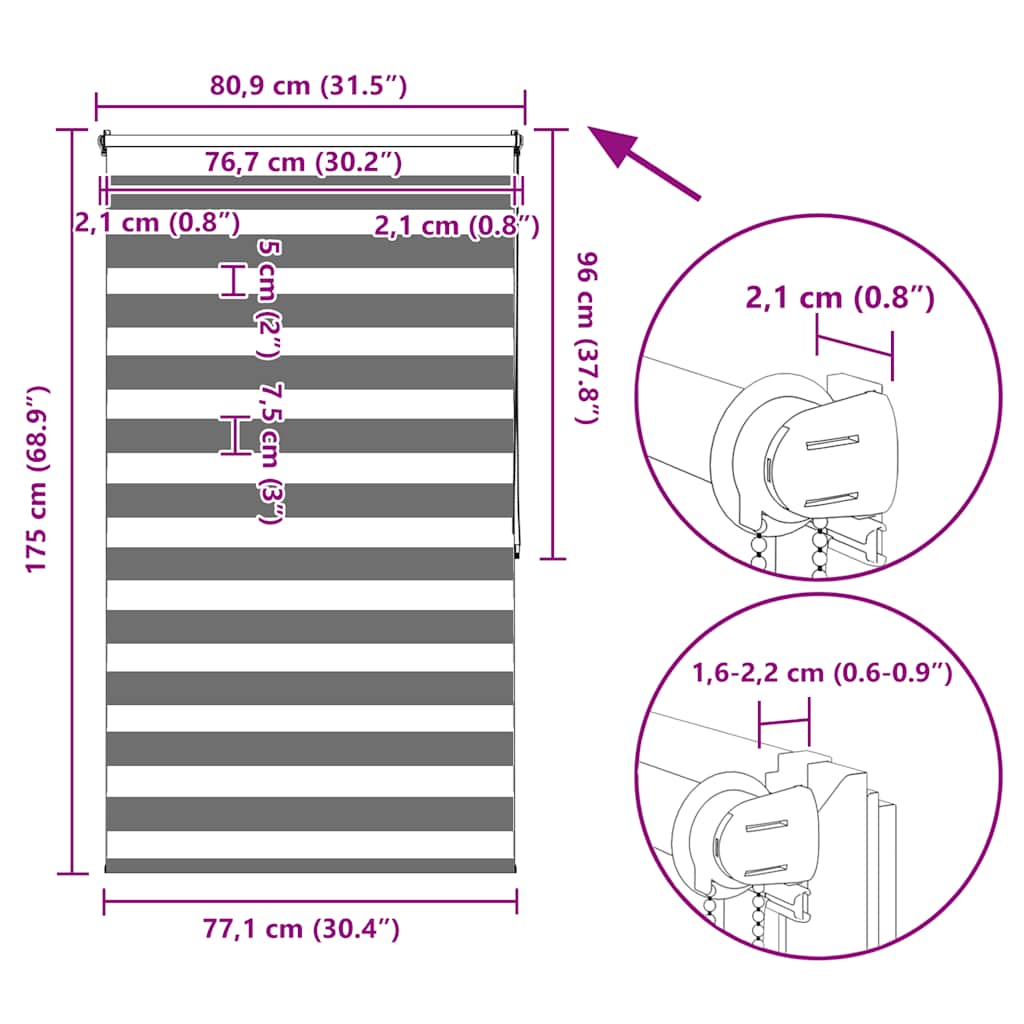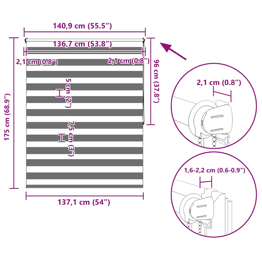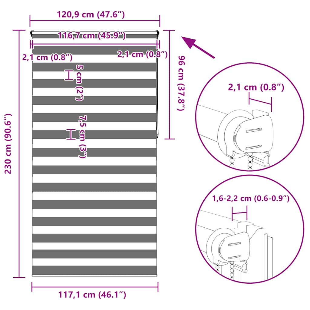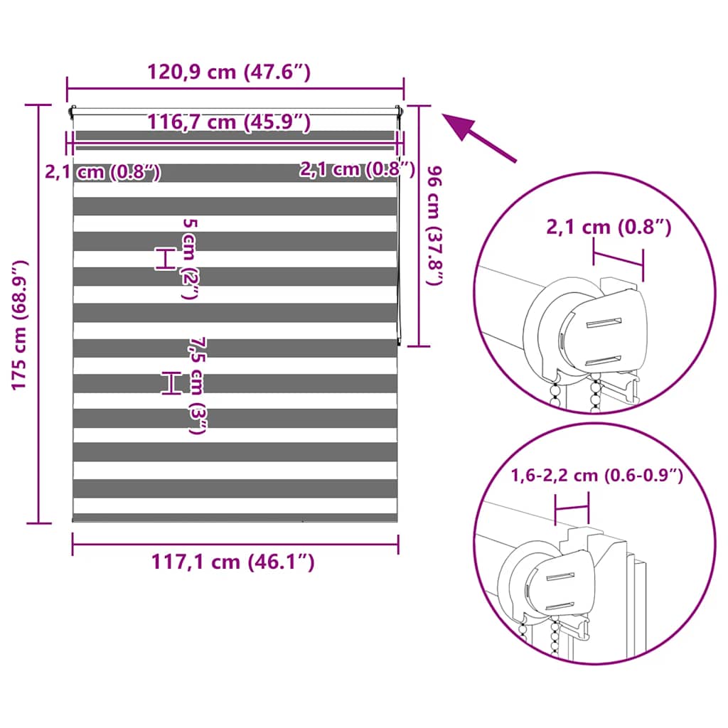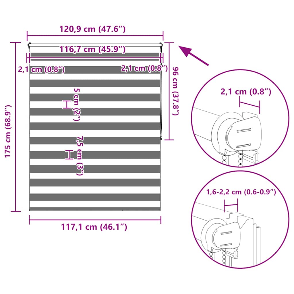 Den neusten Trend in Sachen Licht- und Sichtschutz bietet Ihnen dieses hochwertig verarbeitete Doppelrollo. Durch die 2 parallel verlaufenden Stoffbahnen mit abwechselnd gewebten, transparenten und blickdichten Streifen können Sie mit Hilfe des Kettenzuges das einfallende Licht ganz individuell dosieren. Dabei entstehen wundervolle Lichtspiele. Einfache Bedienung durch Seitenzugkette, das Rollo kann in jeder Höhe gestoppt werden, dies ermöglicht eine komplette oder auf Wunsch nur teilweise Verdunklung des jeweiligen Raumes. Die Klemmhalter werden einfach auf die Innenkante des oberen Fenster-flügels gesetzt. Jegliches Bohren entfällt. Material:100 % Polyester, mit Metallwelle 18 mm (Durchmesser) Kette 2 m lang, Kettenfarbe: weiß Bitte beachten Sie, dass hier angegebene Bestellmaß ist das Trägeraußenmaß, das Stoffmaß des Rollos ist ca. 3 cm geringer. WARNUNG: Kleine Kinder könnten von Schlaufen in Zugschnüren, Ketten, Bändern oder Innenschnüren, welche das Produkt betreiben, stranguliert werden. Um Strangulation oder Verfangen zu vermeiden, halten Sie Schnüre und Kordeln außerhalb der Reichweite von kleinen Kindern. Schnüre könnten sich um den Hals des Kindes wickeln. Schieben Sie Möbel wie Betten oder Kinderbetten weg von Fensterrolloschnüren. Knoten Sie die Schnüre nicht aneinander. Stellen Sie sicher, dass die Schnüre sich nicht verwickeln und keine Schlaufen bilden. Lieferumfang: 1 x 40 cm obere Aluminiumschiene mit 37 x 100 cm Stoff in Zebramuster 1 x 40 cm obere Schiene, 1 x 40 cm schwere untere Schiene 2 x Haken, 2 x Bügel, 1 x Kettenhalter, 2 x Dichtungsring und 1 x Kugelkette